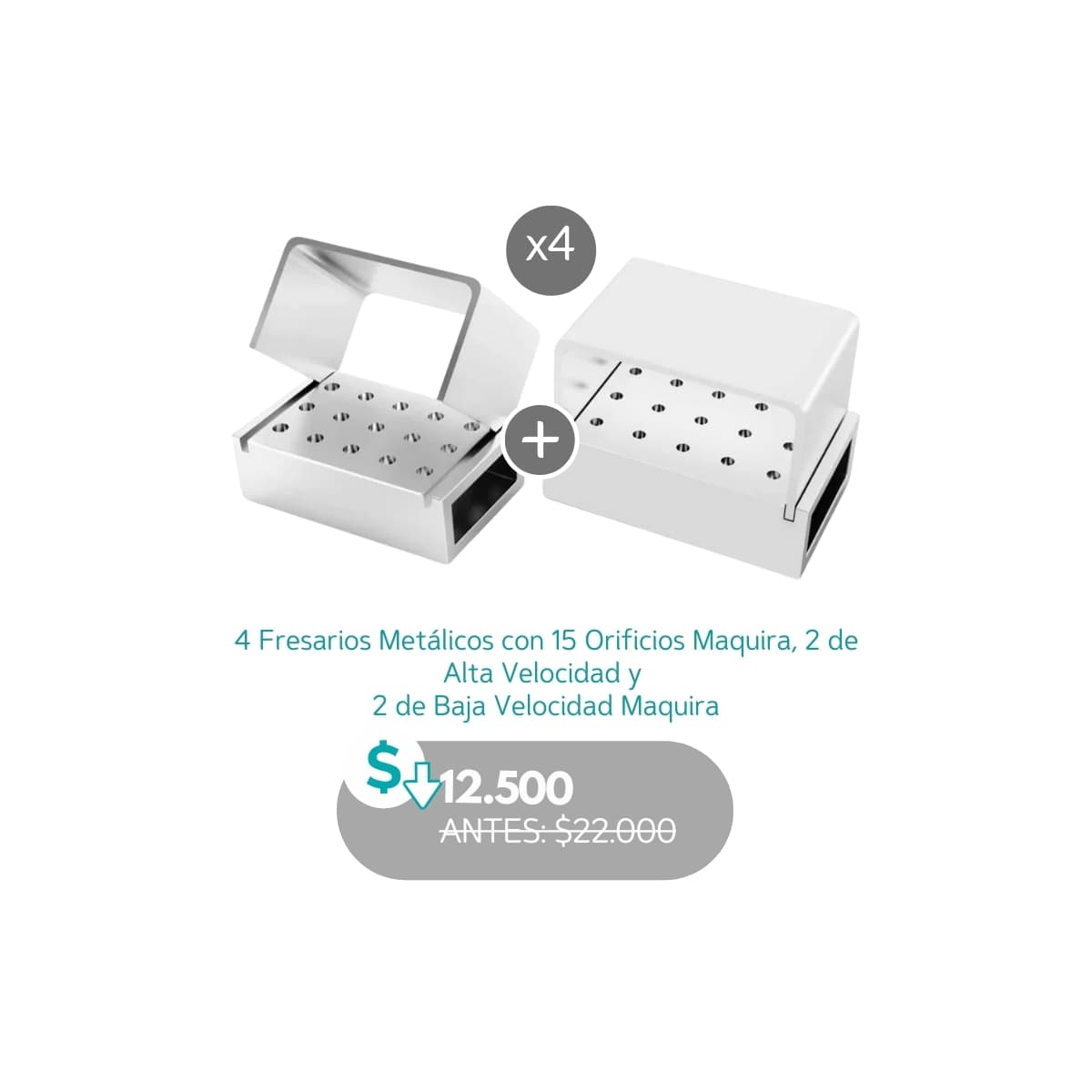 El set incluye 4 fresarios metálicos Maquira con capacidad para 15 fresas cada uno. Contiene 2 fresarios para alta velocidad y 2 para baja velocidad, ofreciendo organización, esterilización y fácil acceso a las fresas durante los procedimientos clínicos. Fabricados en material metálico resistente, aseguran durabilidad y practicidad en la consulta.
