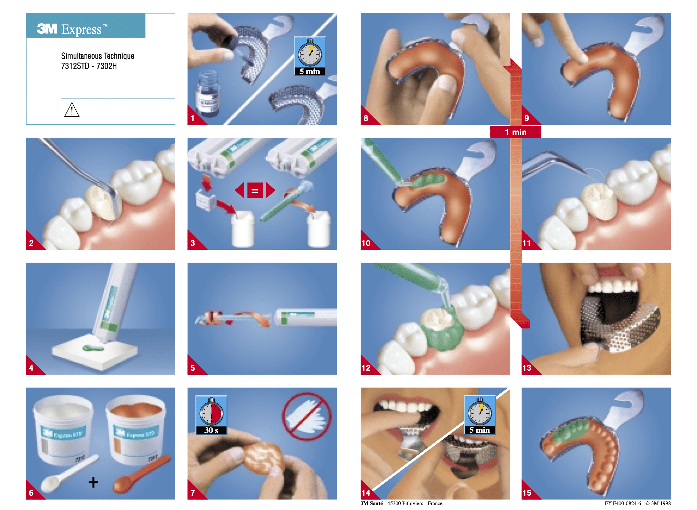 El material de impresión 3M Express VPS es un material de impresión VPS diseñado para ayudarle a crear impresiones precisas de coronas, puentes y dentaduras utilizando técnicas de masilla (pesado)/ligero de 1 o 2 pasos. Este material de impresión dental proporciona una reproducción precisa de los detalles. Este sistema cuenta con una presentación de mezcla manual y automezcla en cartuchos fáciles de usar.